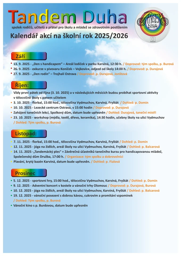Všechny minulé i nadcházející události spolku Tandem Duha přehledně na jednom místě. Zajímá vás, co jsme již zažili nebo co nás čeká?