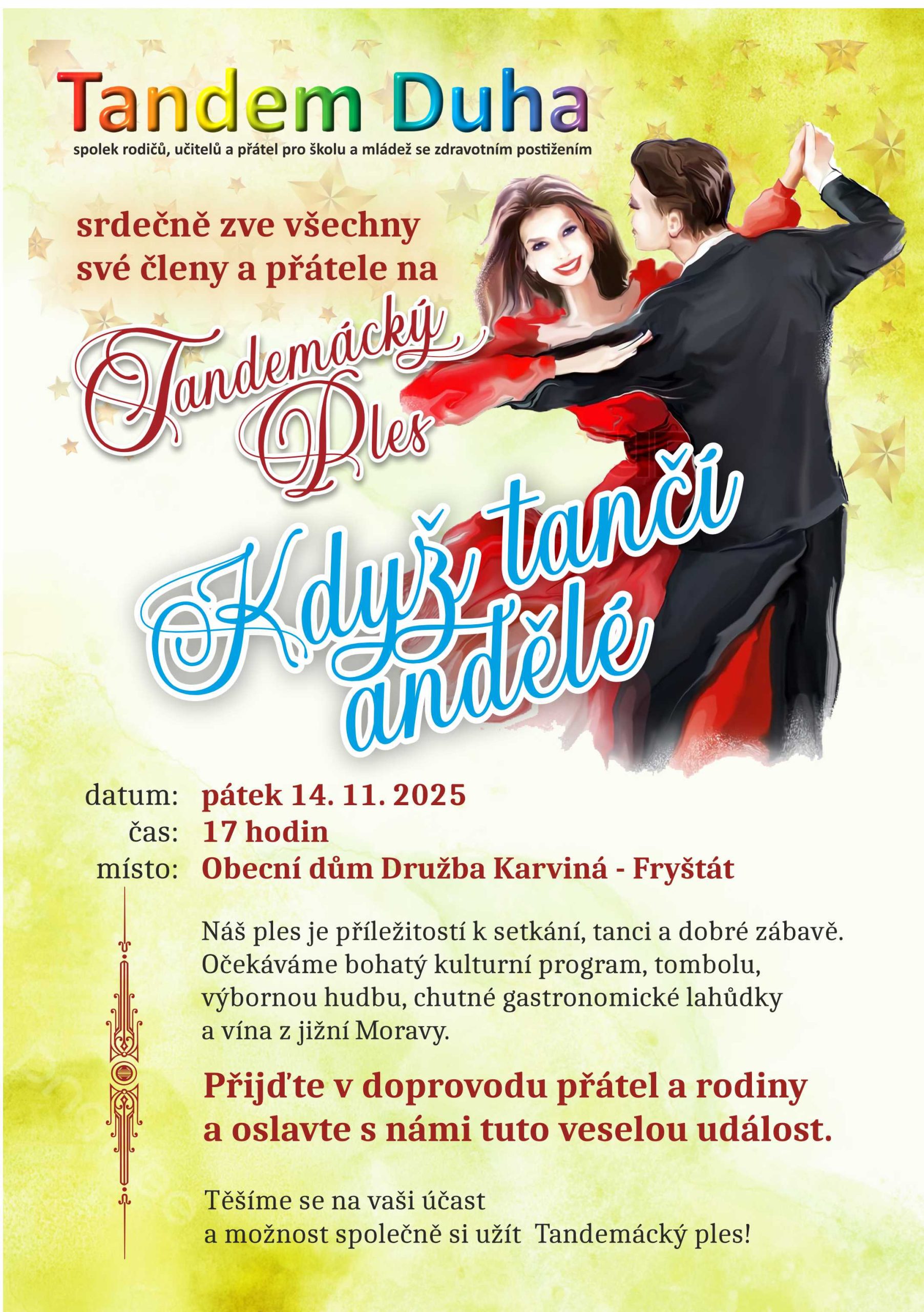 ZobrazitOznámení rodičům, opatrovníkům a členům spolku Tandem Duha Vážení rodiče, opatrovníci a členové spolku, rádi bychom vás informovali, že od 2. května do 4. května 2025 se uskuteční vzdělávací pobyt v ubytovacím zařízení Penzion Zátiší v Komorní Lhotce. Cílem tohoto